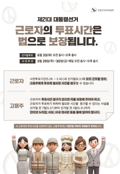 근로자가 투표에 필요한 시간 청구, 고용주가 거절하면 1천만 원 이하 과태료