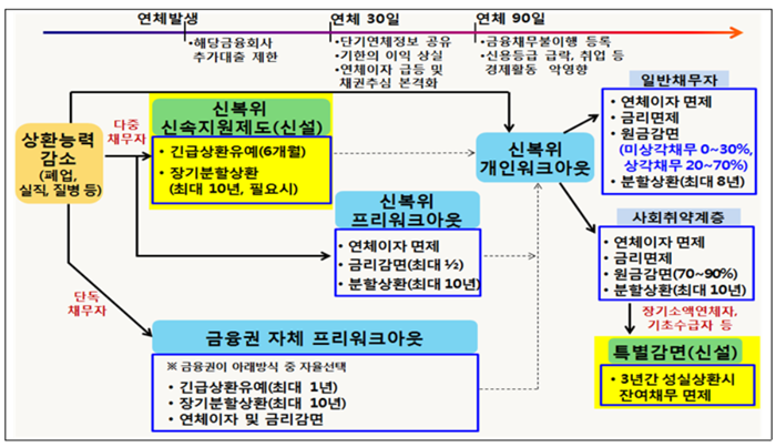 이번 대책은 연체가 발생하기 전에 한 발 먼저 움직인다는 게 특징이다. 기존 제도로는 개인채무자가 쓸 수 있는 가장 빠른 신용회복제도는 연체 30일 이후에 신청 가능한 신복위의 프리워크아웃 제도였다.