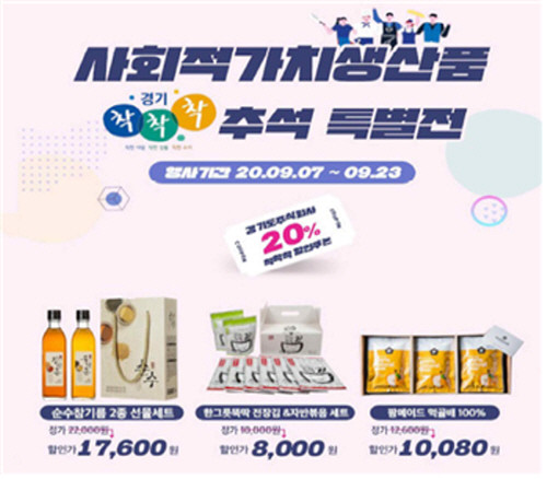 이번 추석 특별전은 올해 코로나19 확산 등으로 지역경제에 시름이 깊은 만큼, 경기도 사회적가치 생산품 공동브랜드 ‘착착착’을 통해 주변과 이웃을 생각하는 사려 깊은 ‘착한 소비’를 활성화하고자 기획됐다.