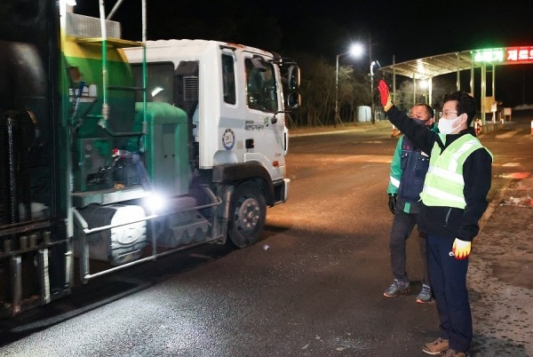 설 명절을 앞둔 5일 새벽, 허태정 대전시장은 유성구 관평동 일원에서 대전도시공사 환경미화원과 함께 생활폐기물을 수거한 후 관계자를 격려했다.