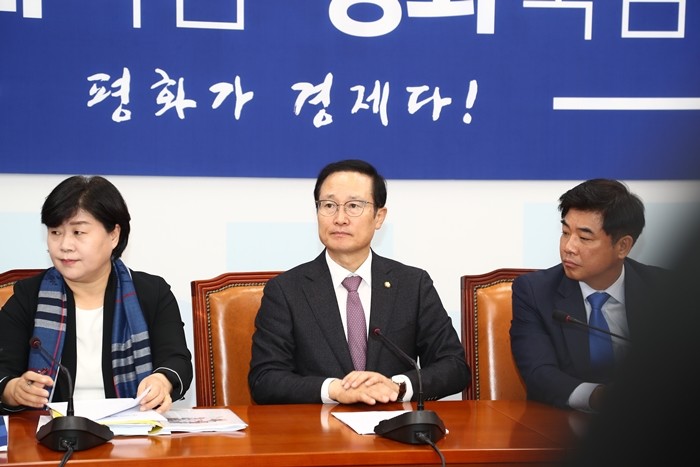 ▲홍영표 더불어민주당 원내대표가 6일 국회에서 열린 민주당 원내정책회의에 참석해 발언을 경청하는 모습. <사진=곽정일 기자> |