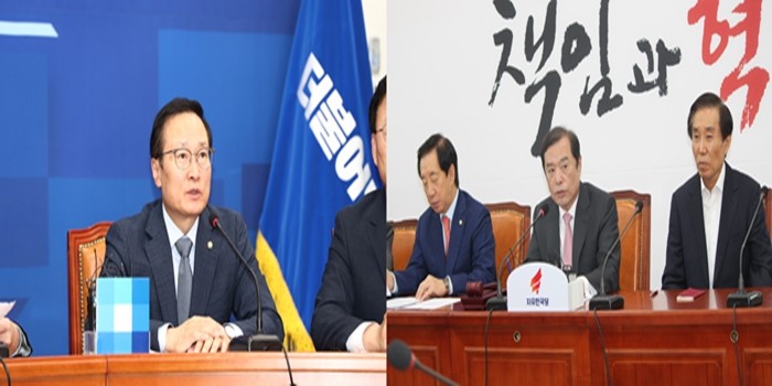 | ▲홍영표 더불어민주당 원내대표(왼쪽)와 김병준 자유한국당 비상대책위원장(오른쪽). <사진=곽정일 기자> |