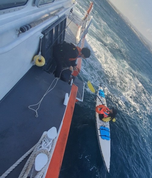 ▲서귀포파출소 연안구조정, 해상에 표류중인 카약동호인 구조 |