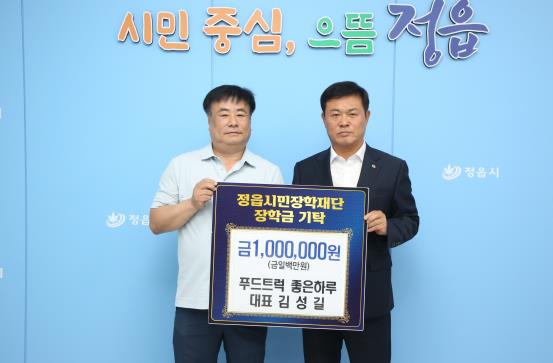 정읍시민장학재단은 29일 김성길 대표가 정읍시청을 방문해 장학금 100만원을 기탁했다고 밝혔다.