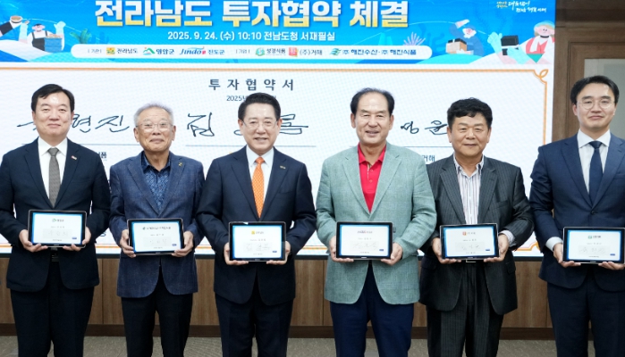 전라남도는 24일 도청 서재필실에서 ㈜성경식품, ㈜해진수산, ㈜해진식품 등 3개사와 투자금액 총 1천34억 원 규모의 투자협약을 했다고 밝혔다. 이번 투자로 302명의 신규 고용 창출도 기대된다.