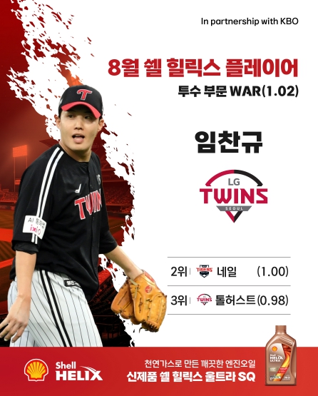 ‘쉘힐릭스플레이어’는 WAR(대체 선수 대비 승리 기여도)를 기준으로 선정하며, 8월 투수 부문에서는 LG 임찬규가 WAR 1.02로 1위를 차지했다. 임찬규는 8월 한 달간 총 29 2/3이닝(공동 11위)을 소화하며 3승(공동 5위)을 기록했다. 이 기간 평균자책점 2.12(3위), WHIP 1.28(15위)를 기록하며 안정적인 피칭으로 팀 선발진의 한 축을 든든히 지켰다.