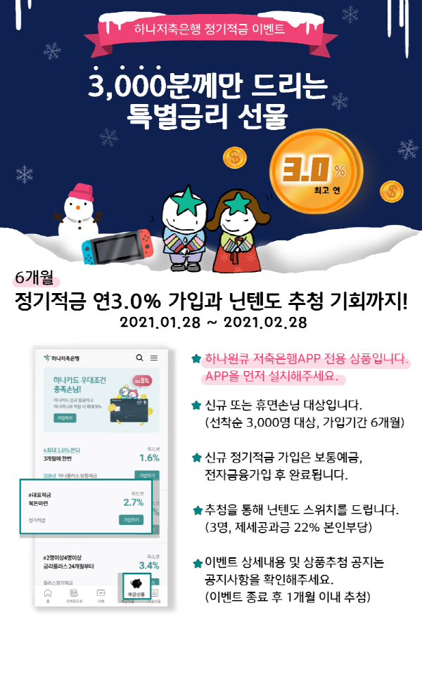 이 상품은 하나원큐 저축은행 앱을 통해 가입 가능하며, 기본금리 2.0%(세전 기준)에 마케팅 동의(우대금리 1.0%) 시 최대 3.0%(세전 기준)의 금리 제공 및 추첨을 통해 3명에게는 닌텐도 스위치를 제공하는 경품 이벤트도 함께 진행된다.