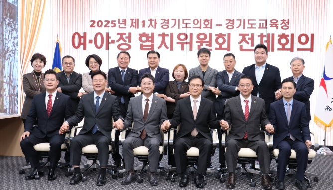 최종현 대표의원과 임태희 교육감, 백현종 국민의힘 대표의원은 이날 도의회 예담채에서 ‘제1차 경기도의회-경기도교육청 여야정협의체 전체회의’를 열고 ‘2026년도 본예산 협치예산 합의문’에 서명했다.