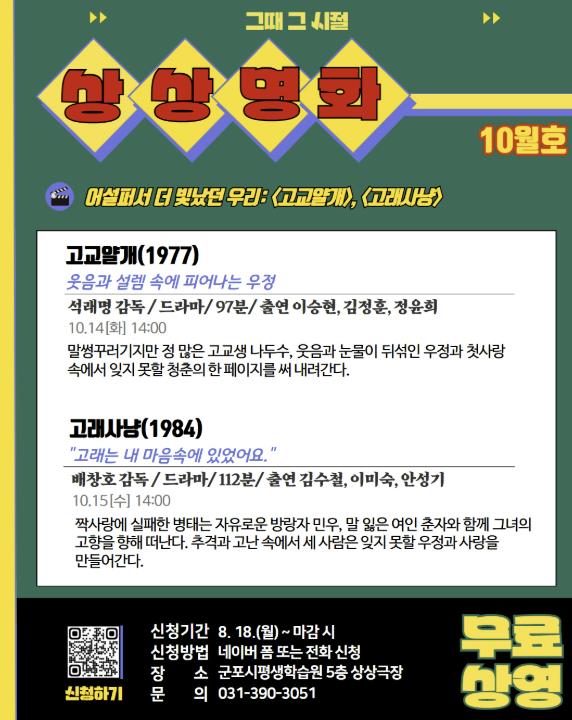 군포문화재단 군포시평생학습원은 시민들의 문화 향유와 세대 공감을 위해 오는 10월 14일과 15일 상상극장에서 고전 영화 상영 프로그램 〈상상명화〉를 운영한다. 이번 상영작은 ‘고교얄개’와 ‘고래사냥’으로 무료 상영된다.
