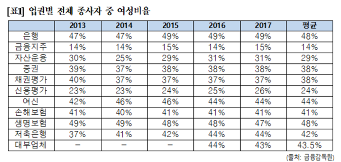 2017년 기준 업권별 여성임원 비율은 ▲ 손해보험(1.1%) ▲ 저축은행(1.3%) ▲ 증권(3%) ▲ 자산운용(3%) ▲ 금융지주(3.9%) ▲ 생명보험(3.9%) ▲ 여신(4.6%) ▲ 대부업체(4.8%) ▲ 신용평가(4.8%) ▲ 채권평가(5%) ▲ 은행(6.7%) 순으로 낮았다.