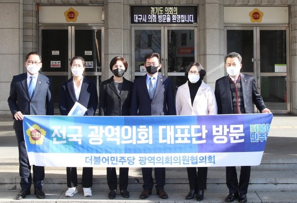 이날 대구광역시의회 더불어민주당은 김혜정 원내대표, 강민구 부의장, 김성태 전 원내대표, 김동식, 이진련 의원 등이 경기도의회 더불어민주당 수석대표단을 환영했다.