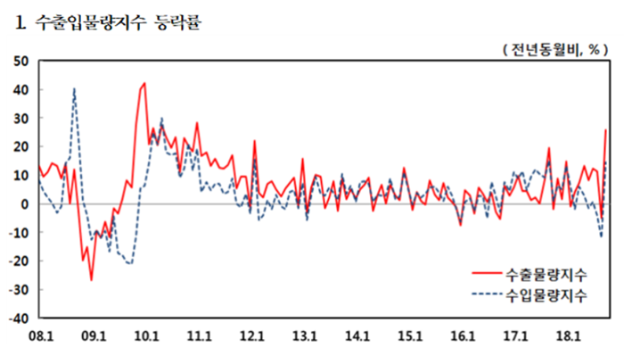 자료에 따르면 전기 및 전자기기(20.1%)와 일반기계(40.8%)가 수출물량지수 상승을 견인했다. 완성차를 중심으로 수송장비(38.4%)와 정밀기기(56.5%) 등도 올랐다.