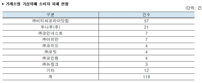 가상화폐 거래소별로는 빗썸이 운영하는 ㈜비티씨코리아닷컴에 대한 피해 구제 신청 건수가 57건으로 가장 많았고, 업비트를 운영하는 ㈜두나무가 21건으로 그 뒤를 이었다.