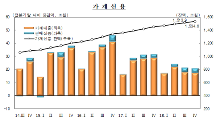 한국은행은 22일 '2018년 4분기 중 가계신용'을 통해 지난해 말 가계신용 잔액은 1년 전보다 83조8000억원(5.8%) 증가한 1534조6000억원으로 집계됐다고 밝혔다.