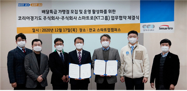 경기도주식회사는 지난 17일 판교 본사에서 스마트로와 ‘배달특급 활성화를 위한 업무협약(MOU)’를 체결하고 내년 24개 지자체에서 진행될 ‘배달특급’ 2차 사업에서 상호 지원 등을 통해 사업을 함께 진행하기로 약속했다.