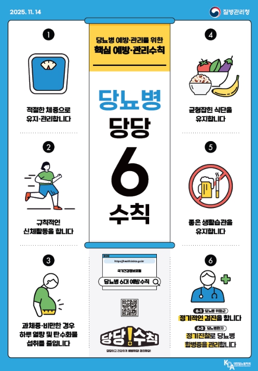 질병관리청은 이번 세계 당뇨병의 날에 맞춰 생활 속 당뇨병 예방·관리 및 자가관리 제고를 위해 6대 당뇨병 예방관리수칙과 수칙별 실천지침을 마련하고, 포스터, 리플릿, 카드뉴스 및 쇼츠영상으로 각각 제작·배포한다.