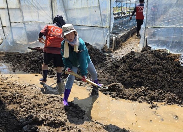 이날 이채영 의원을 비롯한 도의원들은 진흙탕이 된 논과 축사를 오가며 침수된 짚단과 토사, 사료통 등 오염물들을 정리했다.