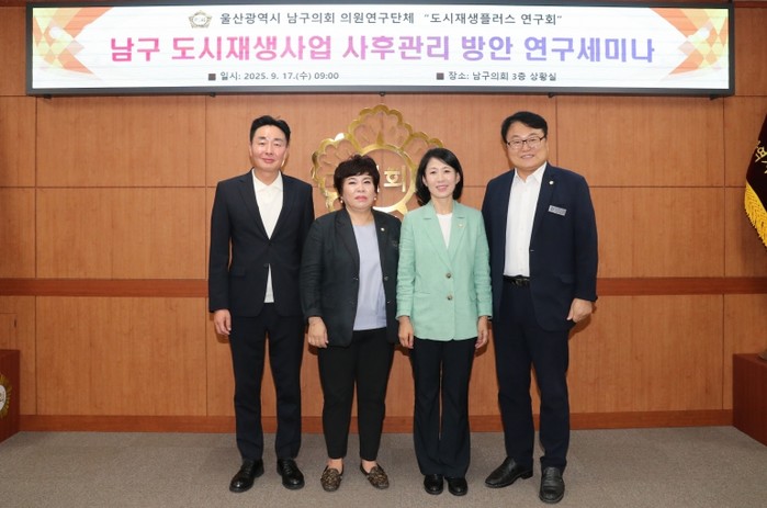 울산 남구의회 의원연구단체인 도시재생플러스연구회는 17일 3층 의회상황실에서 남구 도시재생사업 사후관리 연구와 관련한 정기세미나를 개최했다.