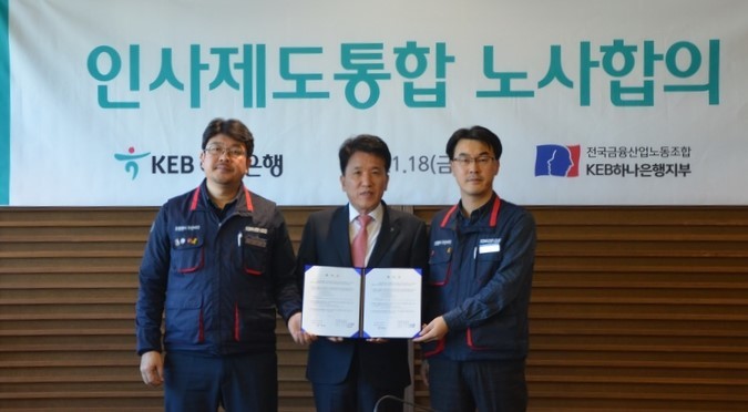 19일 KEB하나은행에 따르면 지난 18일 KEB하나은행 노사는 서울 중구 을지로 본점에서 제도통합 조인식을 개최했다. 노조는 전날(17일) 조합원들을 대상으로 제도통합 잠정합의안에 대한 찬반투표를 실시했다. 총 조합원 1만48명 중 9037명이 참여한 투표에서는 찬성 68.4%, 반대 30.9%로 합의안은 가결됐다.