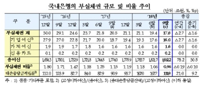 부실채권 잔액은 17조8000억원으로 전분기 말보다 1조6000억원(8.2%) 줄었다. 3분기에 부실채권이 3조6000억원 생겼지만, 이보다 많은 5조2000억원 규모의 부실채권을 정리했기 때문이다.