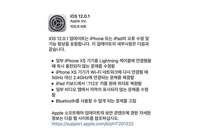 8일(현지시각) 애플은 ‘아이폰XS’에서 나타난 충전 문제 등을 해결한 ‘iOS 12.0.1’을 공식 배포했다. 이번 업데이트는 충전 문제 외에도 와이파이(WIFI)와 블루투스 연결 문제, 아이패드 키보드 문제, 일부 동영상 앱에서 자막이 표시되지 않는 문제 등이 수정됐다.