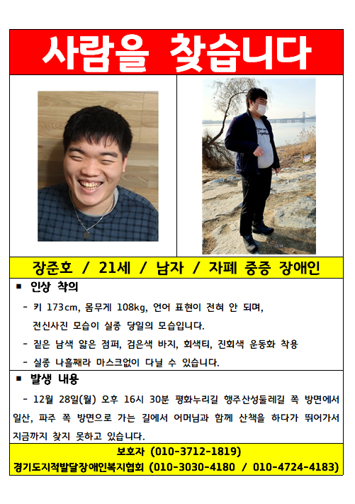 이는 경기도지적발달장애인복지협회 부설 경기도지적장애인자립지원센터를 통해 접수 된 건으로 현재 고양시 관내에서 적극 수색에 나서고 있으나 더 많은 분들의 제보와 협조가 필요한 상황이다.