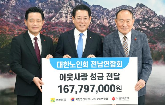 전라남도는 14일 대한노인회 전남연합회가 사회복지공동모금회에 이웃사랑 성금 1억 6천800만 원을 기탁했다고 밝혔다.