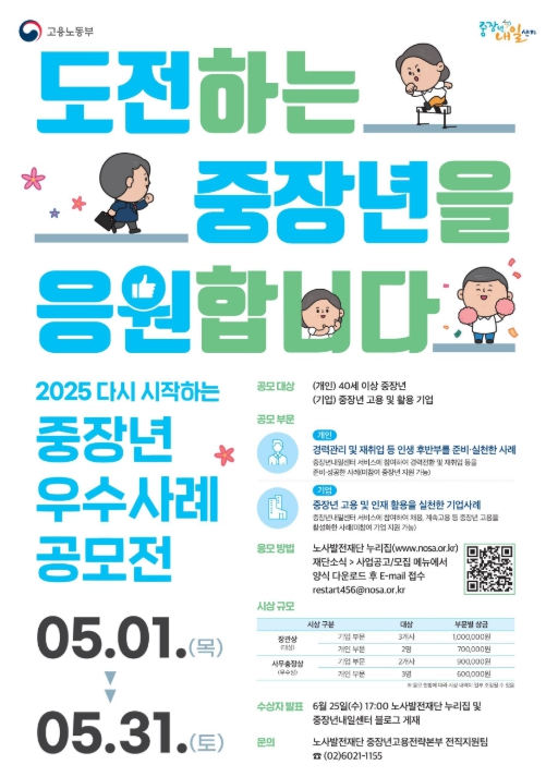 노사발전재단(사무총장 박종필)은 고용노동부와 함께『2025년 다시 시작하는 중장년 우수사례 공모전』을 개최한다고 1일 밝혔다.