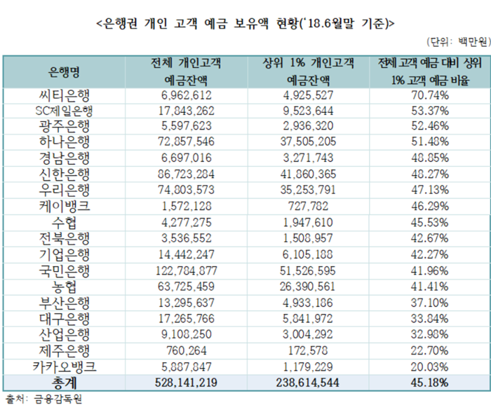 전체 예금잔액 중 상위 1% 고객들이 보유한 예금비율이 가장 높은 은행은 한국씨티은행(70.74%)이었으며, SC제일은행이 53.37%로 그 뒤를 이었다. 외국계 은행의 경우 예금금리와 대출금리가 국내 은행보다 높기 때문이다.
