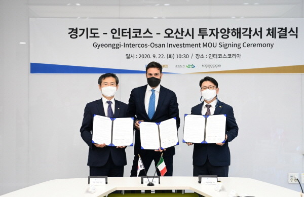이용철 경기도 행정2부지사와 알레산드로 레쿠페로(Alessandro Recupero) ㈜인터코스코리아 대표, 김능식 오산시 부시장은 22일 오산 ㈜인터코스코리아에서 이런 내용을 담은 투자협약을 체결하고 도내 중소화장품 업체들과 상생협력을 다짐했다.