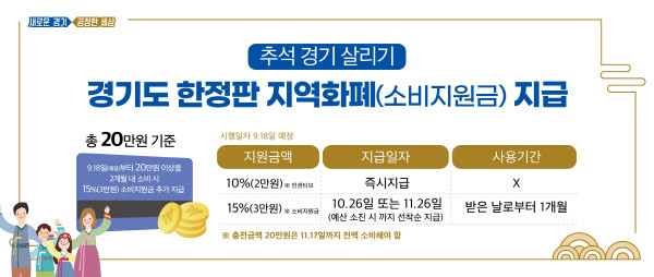 한정판 지역화폐는 예산 소진 시까지 경기지역화폐카드 또는 모바일을 소지한 모든 도민을 대상으로 ‘선착순’ 지급할 예정이다. 한정판 지역화폐 인센티브 혜택을 지급받으려면 9월 18일 이후 사용액 기준으로 늦어도 11월 17일까지 최소 20만원을 소비해야 한다.