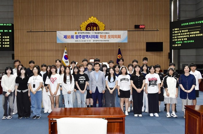 광주광역시의회는 8월 22일 오전 10시 30분 시의회 본회의장에서 북성중학교 학생들을 대상으로 ‘제88회 광주광역시의회 학생 모의의회’를 개최했다.
