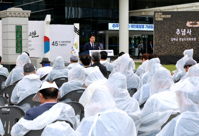김태균 전라남도의회 의장은 5월 16일 전남도청에서 개최된 ‘전남 5·18민주화운동 45주년’ 기념식에 참석하여 “5·18 진상규명과 민주화운동 관련자 지원을 위한 의정활동에 더욱 힘쓰겠다”고 밝혔다.