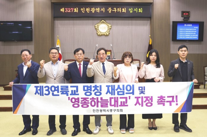 중구의회는 9월 11일, 지난 ‘인천광역시 지명위원회’에서 제3연륙교 명칭을 ‘청라하늘대교’로 의결한 것과 관련하여 제3연륙교 명칭을 재심의하고 ‘영종하늘대교’로 지정할 것을 강력히 촉구하는 결의문을 발표했다.
