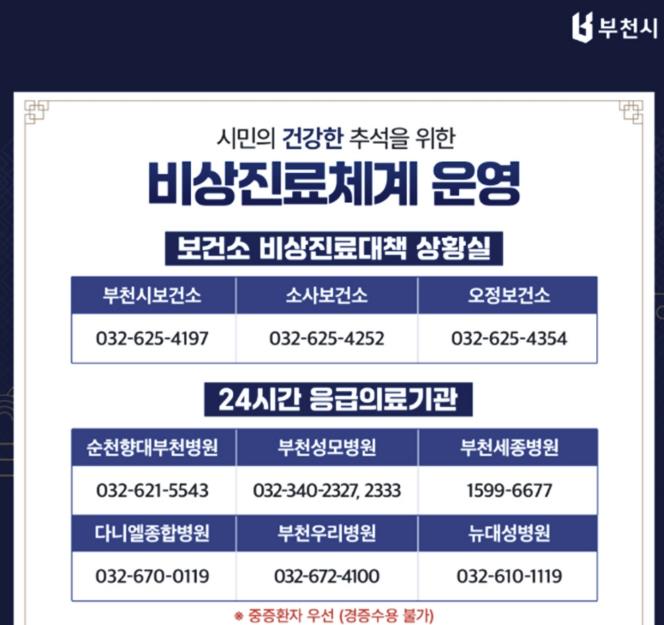 부천시는 추석 연휴 동안 진료 공백을 최소화하기 위해 관내 의료기관과 약국의 협력으로 비상 진료체계를 운영한다.