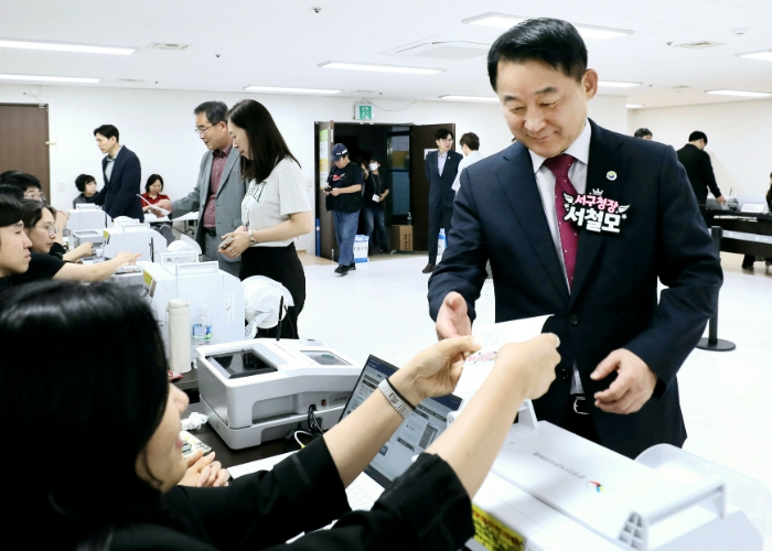 ▲ 29일 서구청 사전투표소에서 투표 중인 서철모 서구청장 |