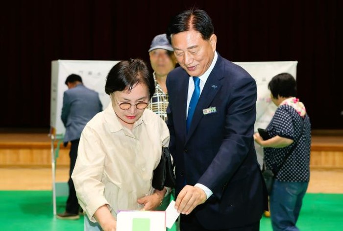 ▲ 김한종 장성군수 내외가 29일 장성읍 사전투표소에서 투표하고 있다. |