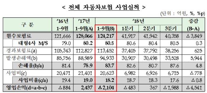 대형 4개사(삼성·현대·DB·KB)의 시장점유율은 80.5%로 2016년 1~9월 79.0%, 2017년 1~9월 80.2%에서 지속해서 증가했으나 4개사 모두 영업손실이 발생했다.
