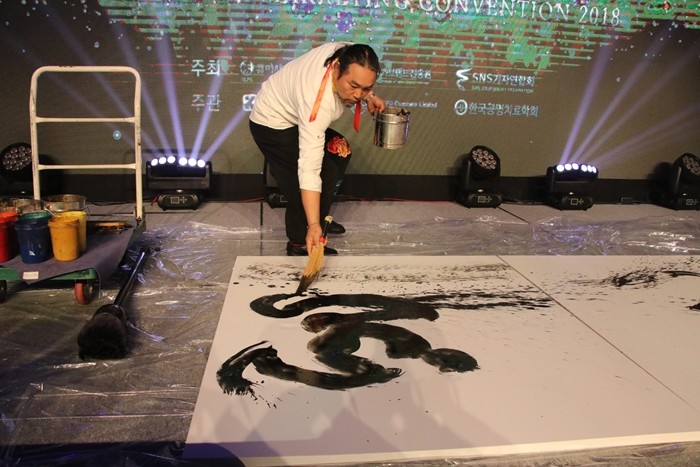 (이슈타임)이찬혁 기자=30일 분당 밀리토피아 호텔에서 개최된 '2018 아시아 스타 마케팅 컨벤션'에서 박수복 화백이 퍼포먼스와 해프닝이 융합된 예술양식인 퍼해밍 액션을 펼치고 있다.
