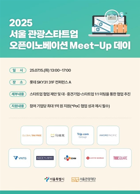 서울시와 서울관광재단이 관광 새싹기업의 새로운 도약을 지원하기 위해 ‘2025 서울 관광새싹기업(스타트업) 개방형 혁신전략(Open Innovation) 교류의 날(Meet-up Day)’을 7월 15일 롯데 스카이31 컨벤션(송파구 올림픽로 300, 롯데월드타워 31층)에서 개최한다.