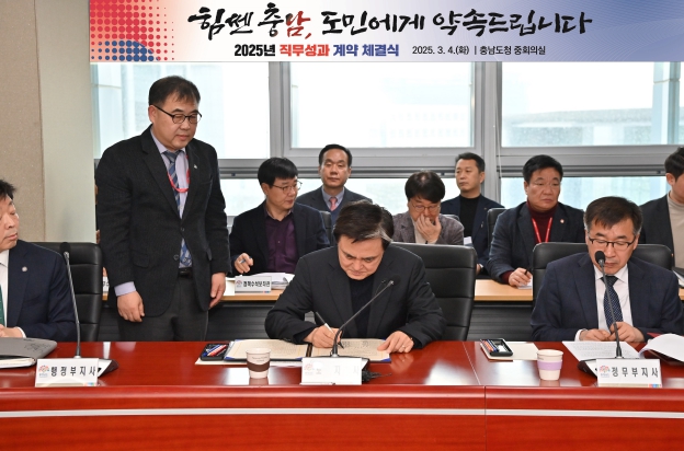 충남도는 4일 도청 대회의실에서 ‘성과 중심의 도전적인 과제’라는 김태흠 지사의 의지를 반영한 4급 이상 간부 대상 ‘2025년 직무성과 계약’을 체결했다.