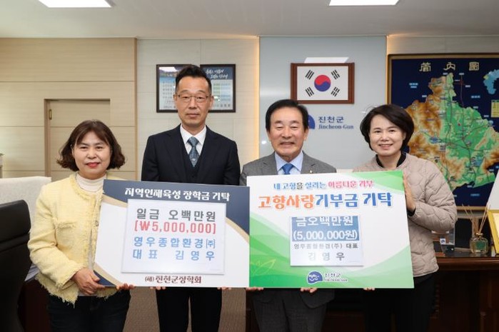 영우종합환경㈜는 7일 진천군청을 찾아 장학금 500만원과 고향사랑기부금 500만원을 전달했다.