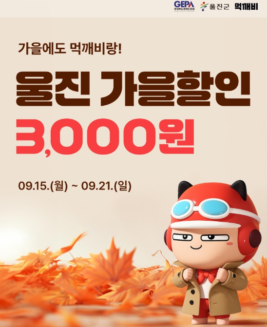 울진군은 9월 15일부터 21일까지 소상공인들의 배달 수수료 부담 완화와 지역경제 활성화를 위해‘공공배달앱 먹깨비’가을맞이 할인 이벤트를 진행한다.