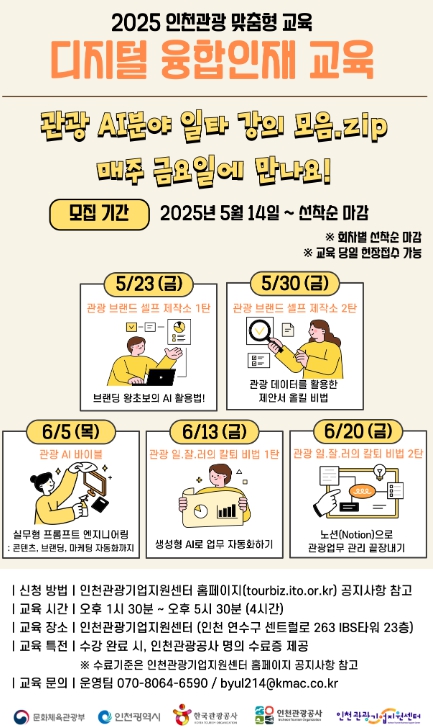 인천광역시와 인천관광공사는 지역 관광기업 경쟁력 강화를 위해 “2025 디지털 융합인재 교육”을 5월 23일부터 6월 20일까지 총 5회에 걸쳐 운영한다고 밝혔다.