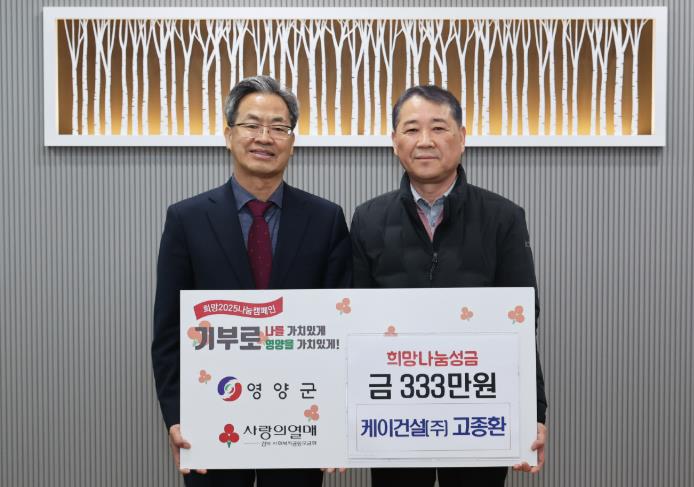 케이건설(주)은 4일 영양군을 방문해 지역의 어려운 이웃들에게 따뜻한 나눔을 실천하고자 성금 333만 4천 원을 기부했다.