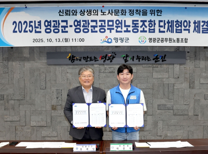 영광군은 지난 10월 13일 군청 2층 소회의실에서 영광군공무원노동조합과 “2025년 단체협약식”을 체결했다.