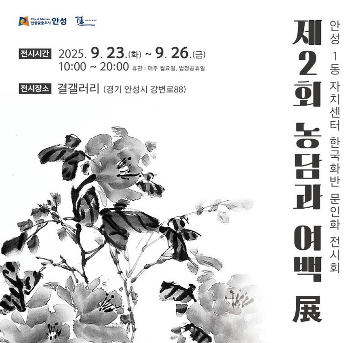 안성1동 자치센터 한국화반은 오는 9월 23일부터 9월 26일까지 안성천 작은미술관 결갤러리에서 ‘제2회 농담과 여백전’을 개최한다.