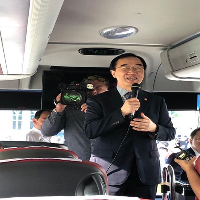 | 20일 이산가족상봉을 위해 북한으로 출발하는 이산가족을 배웅하고 있는 조명균 통일부 장관. <사진=통일부 제공> |