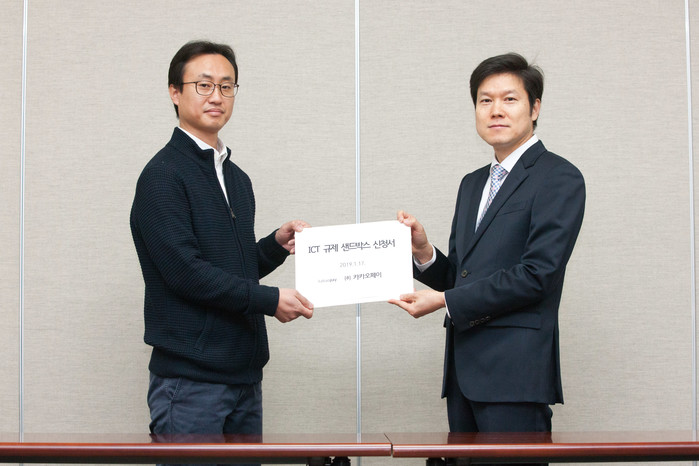 | ▲ 17일 오전 경기도 과천시 관문로 정부과천청사 과학기술정보통신부 중간소통방에서 오승준 카카오페이 온라인사업총괄 실장(왼쪽)이 김광의 과학기술정보통신부 인터넷제도혁신과 연구관(오른쪽)에게 ICT 규제 샌드박스 신청서를 제출하고 있다. <사진=카카오페이 제공> |
