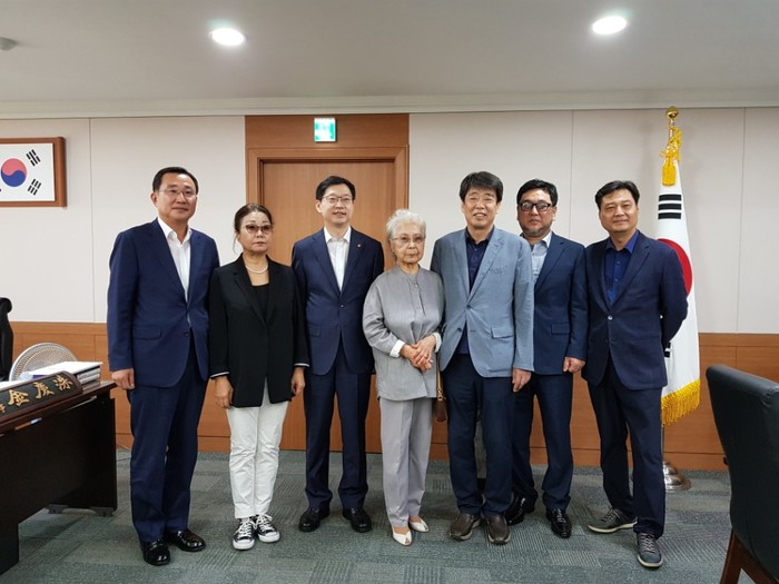 ▲30일 고 윤이상 선생 가족과 경남도청을 방문해 김경수 도지사를 만난 신계륜 전 의원(오른쪽에서 세번째). <사진=신계륜 의원 홈페이지> |